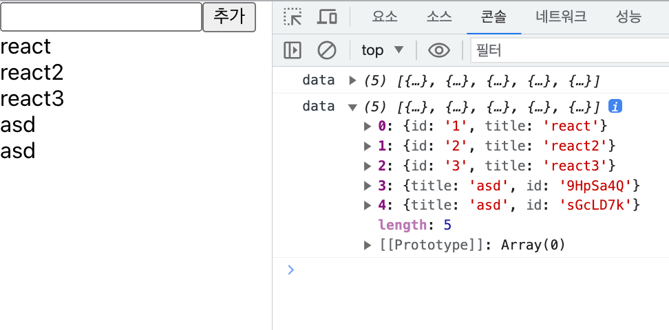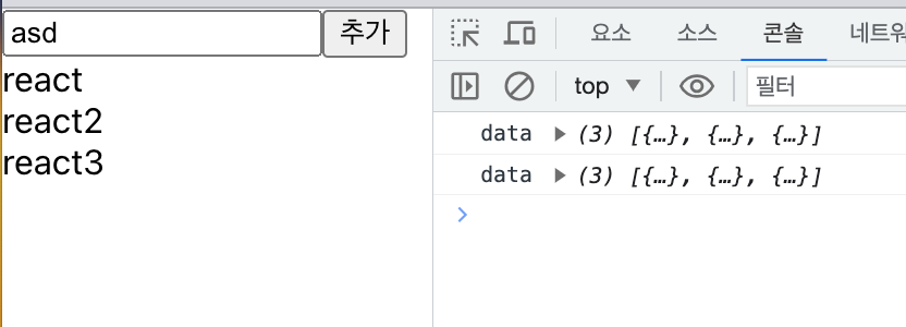 - 현재는 input을 입력하고 엔터 누르고 새로고침을 해야 데이터가 추가된 것을 콘솔에서 볼 수 있음