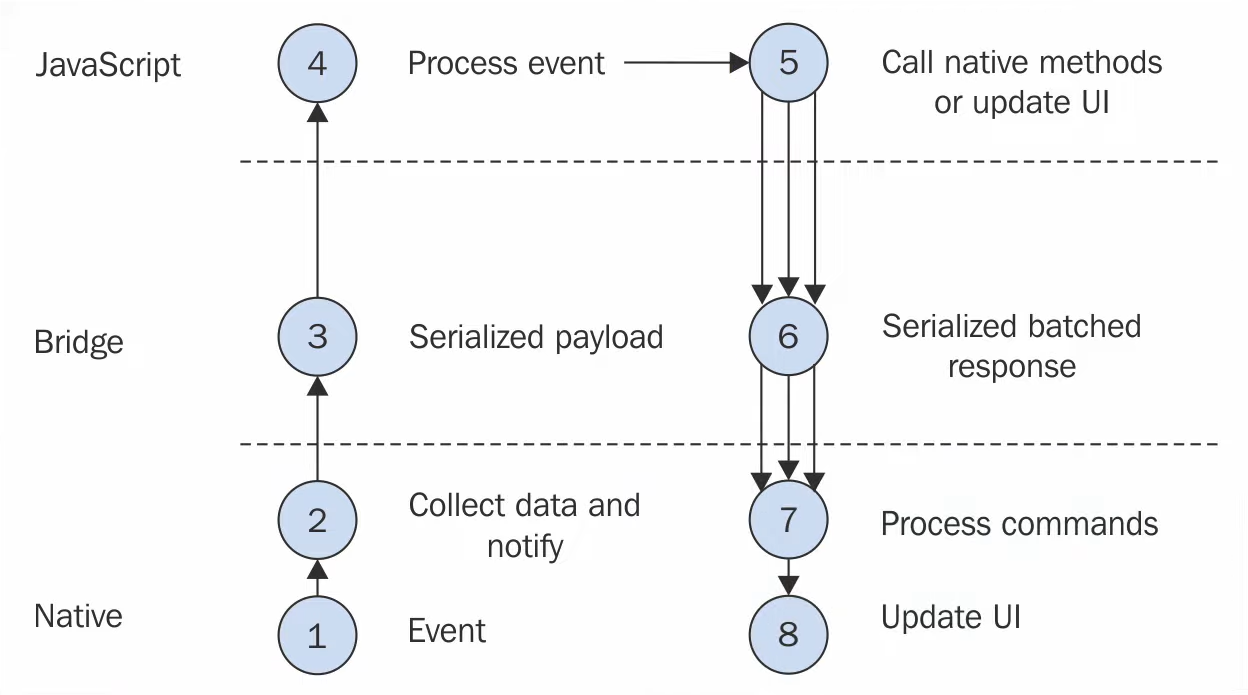 React Native의 아키텍처는 자바스크립트 스레드와 네이티브 스레드 간의 통신에 브릿지를 사용한다. 브릿지는 데이터를 JSON 형식으로 직렬화하여 이 두 스레드 간에 전달하는 역할을 한다. 이러한 통신 방식은 비동기적이며, 모든 자바스크립트 작업은 단일 스레드에서 처리된다.