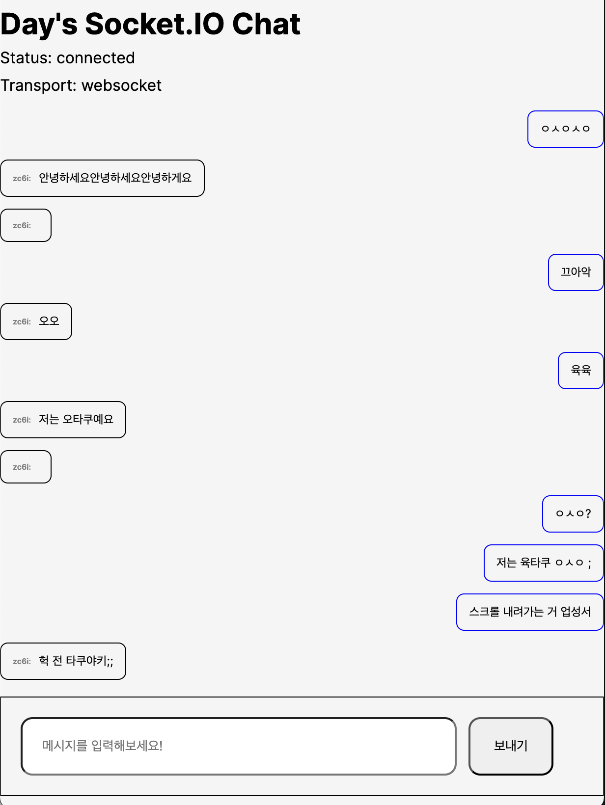 - slack처럼 사용자가 입력 중이라면 입력 중 메시지 띄우기 (이건 textinput에 이벤트 걸어서 전달하면 될 것 같음)